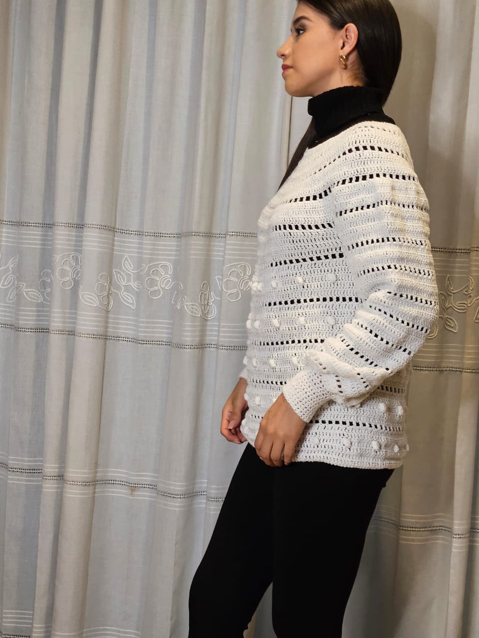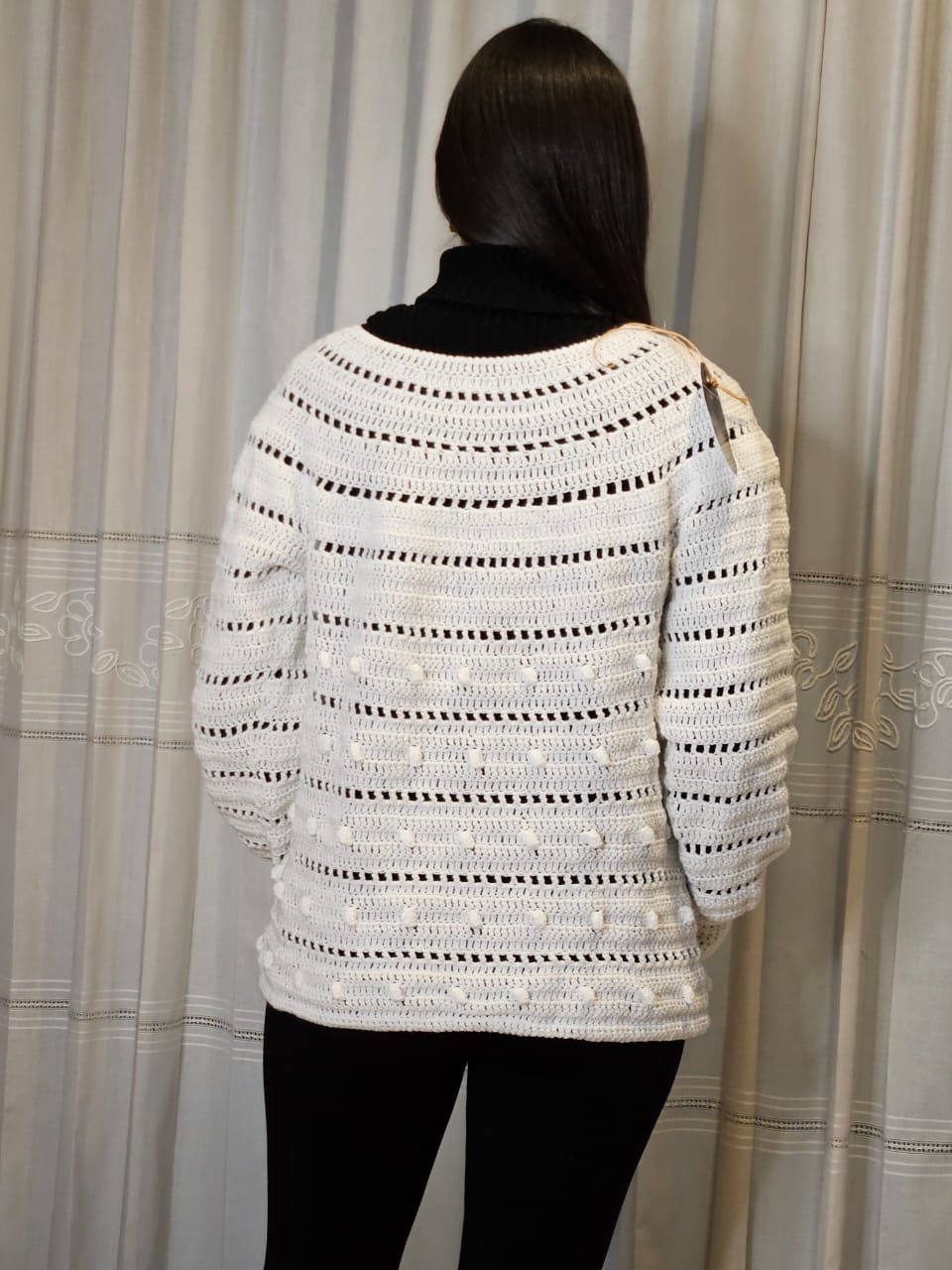 Tejido en crochet. Suéter blanco cerrado en estambre de lana de importación en color blanco.