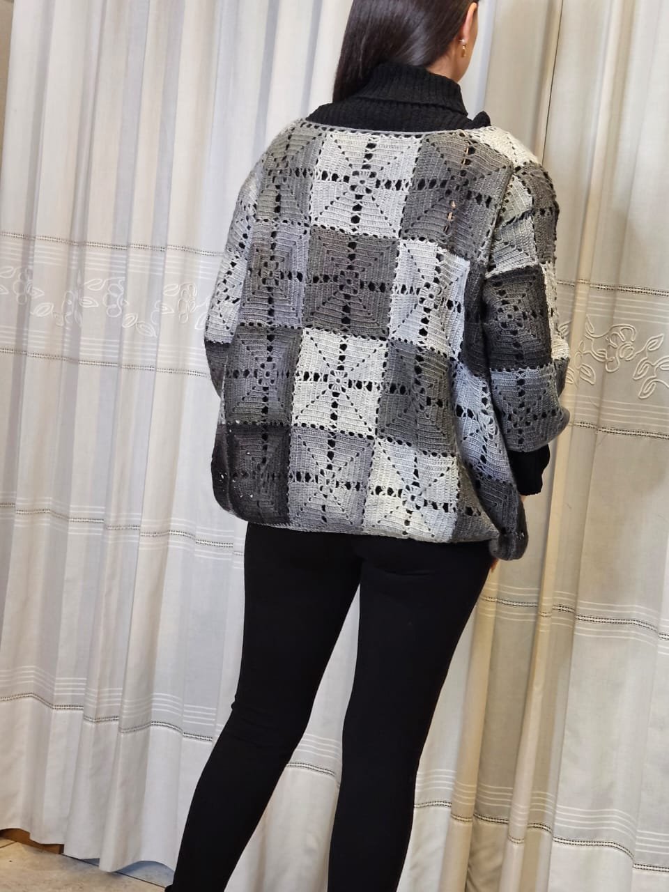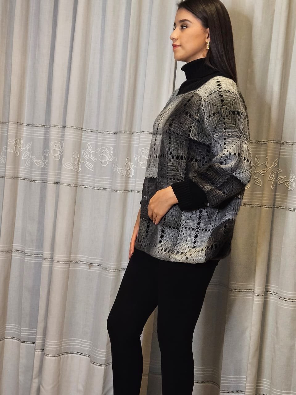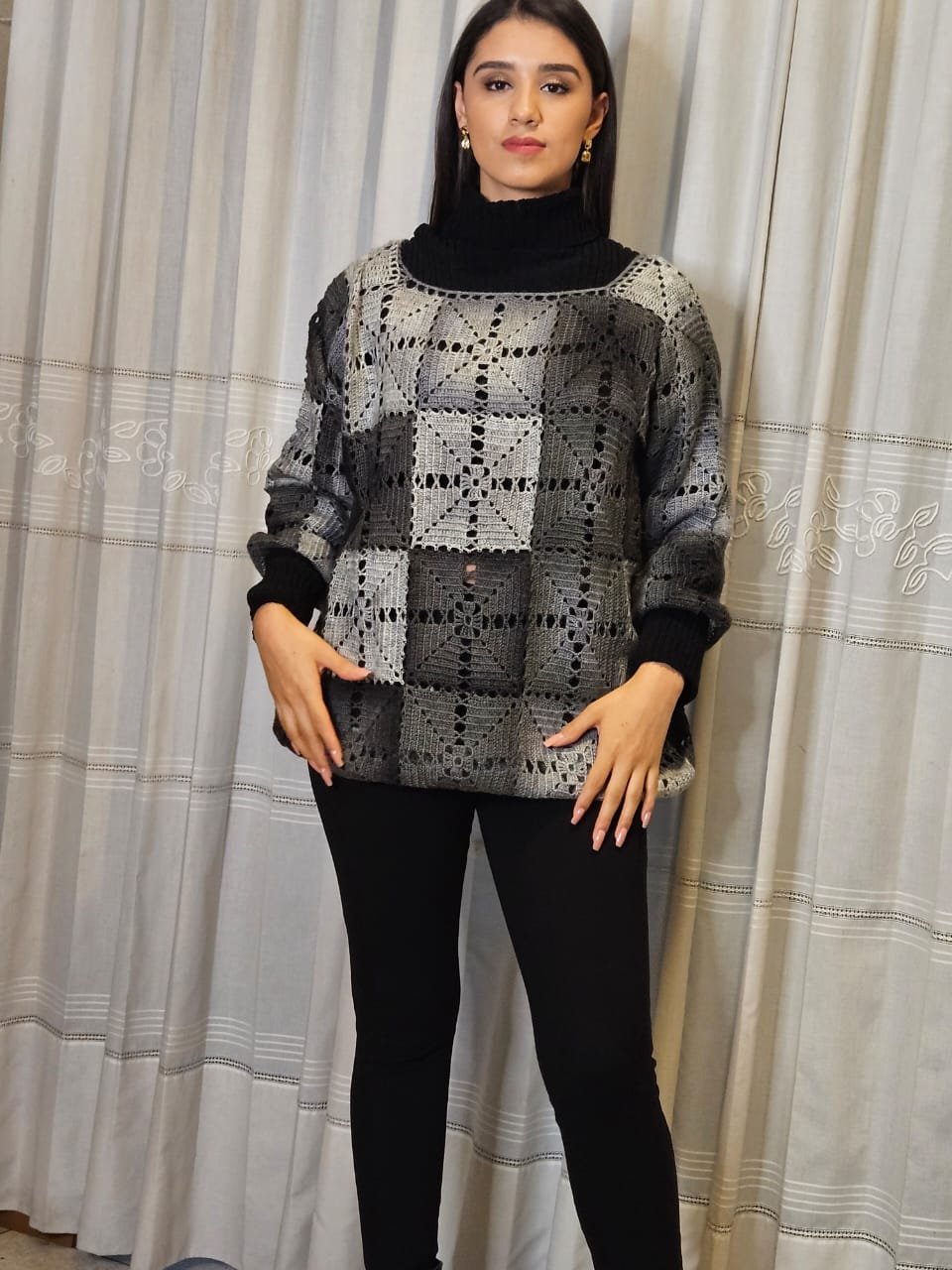 Tejido en crochet. Suéter cerrado en estambre de lana de importación en color gris.
